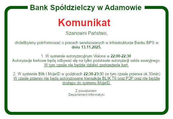 Witamy na stronie Banku Spółdzielczego w Adamowie